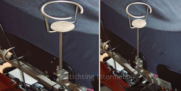 Deze drinkbekerstandaard kan ik dus in een buisje naast de rolstoel laten steken. Het steekt niet uit buiten de rolstoel. Ook is hij er dus makkelijk uit te halen als je hem niet nodig hebt. Dan steek ik hem bij de hoofdsteun achter het schuim. Het rondje van de drinkbekerstandaard is wel redelijk klein voor grote glazen. Als het niet past, vraag ik of het in een ander glas kan. Ik heb altijd wat rietjes bij me in de rolstoel naast het schuim. Op de foto zie je net wat rose van het rietje. Een handige aanpassing dus zodat ik ook een keer zelf kan drinken als ik uit eten ga of ergens iets drink tijdens het winkelen. Ook deze aanpassing is gemaakt door RTD Het Dorp.