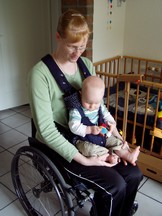Al voor we (Anneke en haar man) zwanger waren, wisten we al dat we vroeg met ons kindje wilde gaan zwemmen. We hebben in de buurt zoveel water liggen. We wonen in een dorp aan een grote rivier. We hebben op 1 kilometer afstand aan de ene kant de gracht van het kasteel en op 1 kilometer afstand aan de andere kant liggen diverse sloten in de bossen. Daarbij hebben we achter in de tuin een zwembad liggen, dus vroeg leren zwemmen is zeer gewenst. Anneke met Stijn op de rolstoel