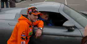 Rene in de Porsche met ambassadeur Christijan Albers Miranda met Christijan in de Porsche