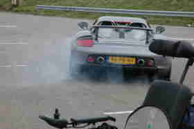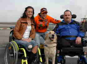 christijan rijdt met piepende banden weg met Rene in de auto Christijan, Miranda, Rene met zijn hulphond samen op de foto op het park circuit Zandvoort
