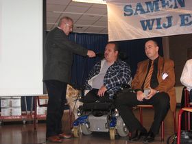 Emile vertelt kort wat over Stichting Intermobiel en wenst de studenten veel succes met de verkoop Rene Penders is aanwezig namens de doelgroep van Stichting Intermobiel met hulphond Orca