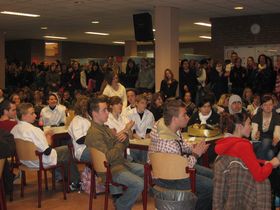 Zanger Big Benny die ook heeft meegewerkt aan deze cd wenst de studenten veel succes Alle studenten zitten in de aula zaal te wachten tot ze met de cd's de straat op kunnen