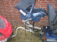 Onder de bevestiging van het stoeltje en de Maxicosi is een soort trekhaak gemaakt. Hiermee kan ik de fietskar bevestigen. De fietskar is geleverd door RVS en deze hoort als het ware bij de scootmobiel. Daarom is dit ook de enige die door de gemeente vergoed werd. De bevestiging van de fietskar is wel verlengd omdat ik anders geen bochten kon nemen, de stang duwde dan steeds tegen de maxicosi of fietsstoel aan. Nu werkt het prima. Eigenlijk was in het begin de bedoeling om in de fietskar een babyschaal te plaatsen voor de maxicosi, en het fietstoeltje gewoon te laten zitten voor mijn oudste zoontje. Je hebt de baby dan lekker warm en beschut in de kar, dat vond ik toch een wat fijner idee. Maar daar wilde de leverancier niet aan meewerken. I.v.m. aansprakelijkheid wilden RVS, Ligtvoet en de gemeente zich daar de vingers niet aan branden. Daarom is uiteindelijk voor deze oplossing gekozen.