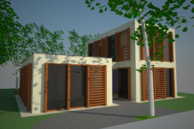 | begin februari 2009: de maquette van de vakantiewoning gemaakt door Loek Reijnen en Emile Cobben. Ook twee 3D afbeeldingen van de vakantiewoning. | ![]() ![]() |
