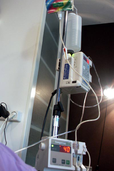 Naast mijn bed staan mijn pompen. Deze zorgen ervoor dat ik voldoende water en voldoende voeding naar binnen krijg. Ik krijg de voeding en het water naar binnen door een sonde door mijn neus. Tegenwoordig kan het ook via een zogenaamde PEG- sonde. Dan gaat de sonde naar de maag via een gaatje in je buik. Ik eet en drink wel wat, maar niet genoeg om alle benodigde voedingsstoffen en vocht binnen te krijgen.