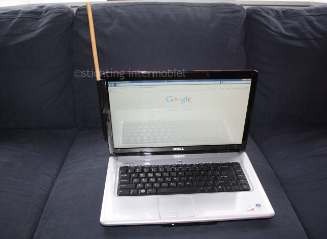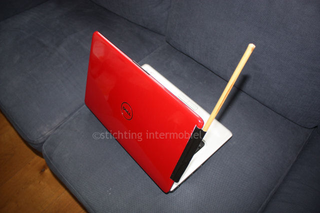 Om de weerstand te verminderen bij het open en sluiten van mijn laptop, een stokje eraan. Dit met ducktape vastgezet en zo werkt het goed. Een ‘officiele’oplossing is er niet, heeft de ergotherapeute naar gezocht.