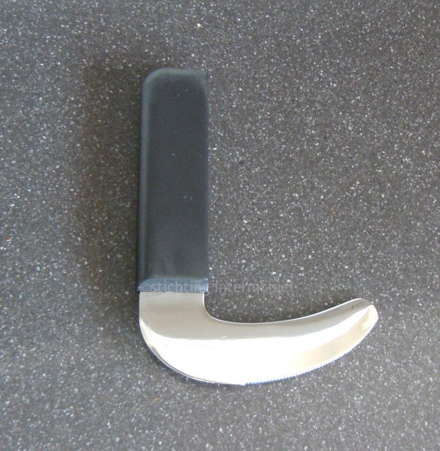 Omdat ik een gewoon mes niet goed kan vasthouden, gebruik ik een gehoekt mes. Het is in het begin even wennen omdat je er niet mee snijdt zoals een gewoon mes dat doet. Je maakt meer een soort van 'hak' beweging. Je gaat als het ware mee in de vorm van het mes.