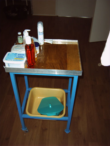 We hebben dit karretje zelf gemaakt, omdat het andere oude karretje zo gammel was dat alle spullen eraf vielen als je hem van de douche naar de slaapkamer reed. Ik en de adl’ers hebben er veel gemak van.