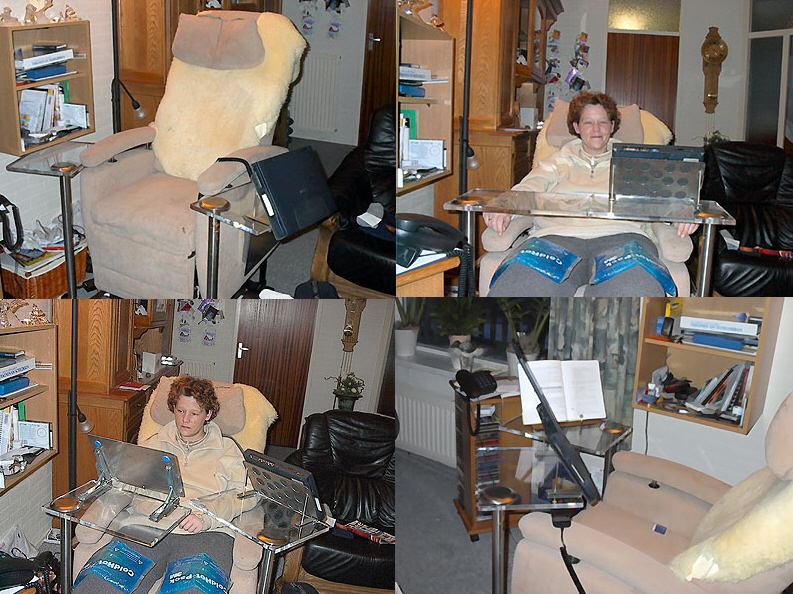 Het idee is ontstaan, omdat een gewoon ziekenhuis bijzet tafeltje niet werkte. Toen kwam een ontwikkelaar met een idee om een tafel op 1 poot te maken die naast mijn sta-op-en-lig-stoel kan staan. Deze tafel kan ook nog draaien. Zo kwamen er meer en meer ideeën. Zo ook de standaard voor de laptop en de standaard waar ik een boek op kan zetten om te lezen. (foto 1) Ook kan ik vanuit mijn stoel met deze tafel tekenen. (foto 2) De tafel heeft een groot blad waar veel op kan staan. Zo kan ik vanuit mijn stoel makkelijk achter de laptop werken. (foto 3) De tafel heeft dus een blad dat je uit elkaar kunt draaien, zodat je twee losse bladen krijgt. Hierdoor kan ik dus én een boek inkijken én achter de laptop zitten. Ook kan ik de twee losse bladen wegdoen waardoor ik niet steeds onder de tafel hoef te liggen. (foto 4) Ik heb heel veel plezier aan deze tafel. Voor iedereen die, net als ik, veel moet liggen is deze tafel ideaal en zeker aan te raden!