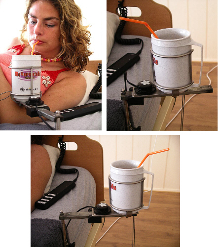 Het bovenste deel waar de houder op bevestigd is, is een soort rail van een keukenla. Ik kan de beker dus licht naar me toe halen of terug duwen. Dit is handig, want als ik slecht ben en niet veel kan bewegen kan de beker dichtbij me worden gezet. Ze hebben de standaard waar de beker in kan gemaakt aan de hand van een thermos beker die ik zelf altijd overdag gebruik. Er kunnen ook andere glazen in. Ik kan dus zo zelfstandig drinken op een goede hoogte. Als het bijv. op een nachtkastje staat, moet je ook vaak je bed aanpassen aan de hoogte. (zie foto midden)