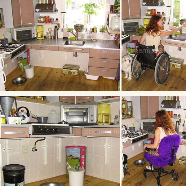 Toen ik ging verhuizen naar een aangepaste woning zat deze keuken er al in. De kookplaat en de afzuigkap hebben we wel zelf gekocht. De keuken is mechanisch verstelbaar, dus als het nodig is kan ik de keuken ook omhoog of omlaag draaien. Het is voor mij een te zware handeling, maar we hebben hem zo staan dat zowel mijn man als ik er goed bij kan. Ik heb nog overwogen of ik elektrisch zou aanvragen, maar sinds ik hoog-laag verstelling op de rolstoel heb is dit niet meer nodig. Bij de keuken hoort ook een ladenblok waar je de koelkast op kan zetten. Hierdoor is de koelkast ook op de goede hoogte.