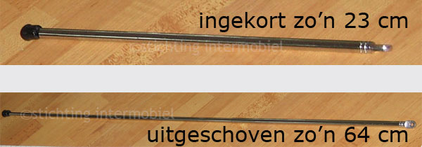 Met deze uitschuifantenne kan ik vaak net de knoppen van een lift induwen (mijn reikwijdte is te klein om dat met de hand te doen). De knoppen moeten wel licht gaan. Als ik het niet gebruik, ligt de antenne ingeschoven op schoot. Voor een betere grip heb ik een rubber dopje op de punt gezet.