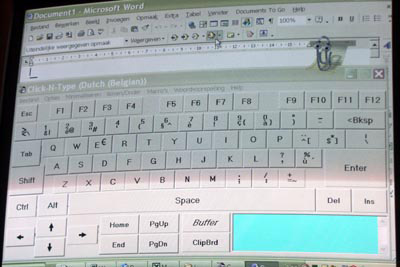 Ik gebruik het programma click- it om teksten in te voeren. Dit kan door muis over het scherm te bewegen of via andere invoer. Click it is gratis te downloaden. Je vindt daar nog veel meer makkelijke hulpjes.
