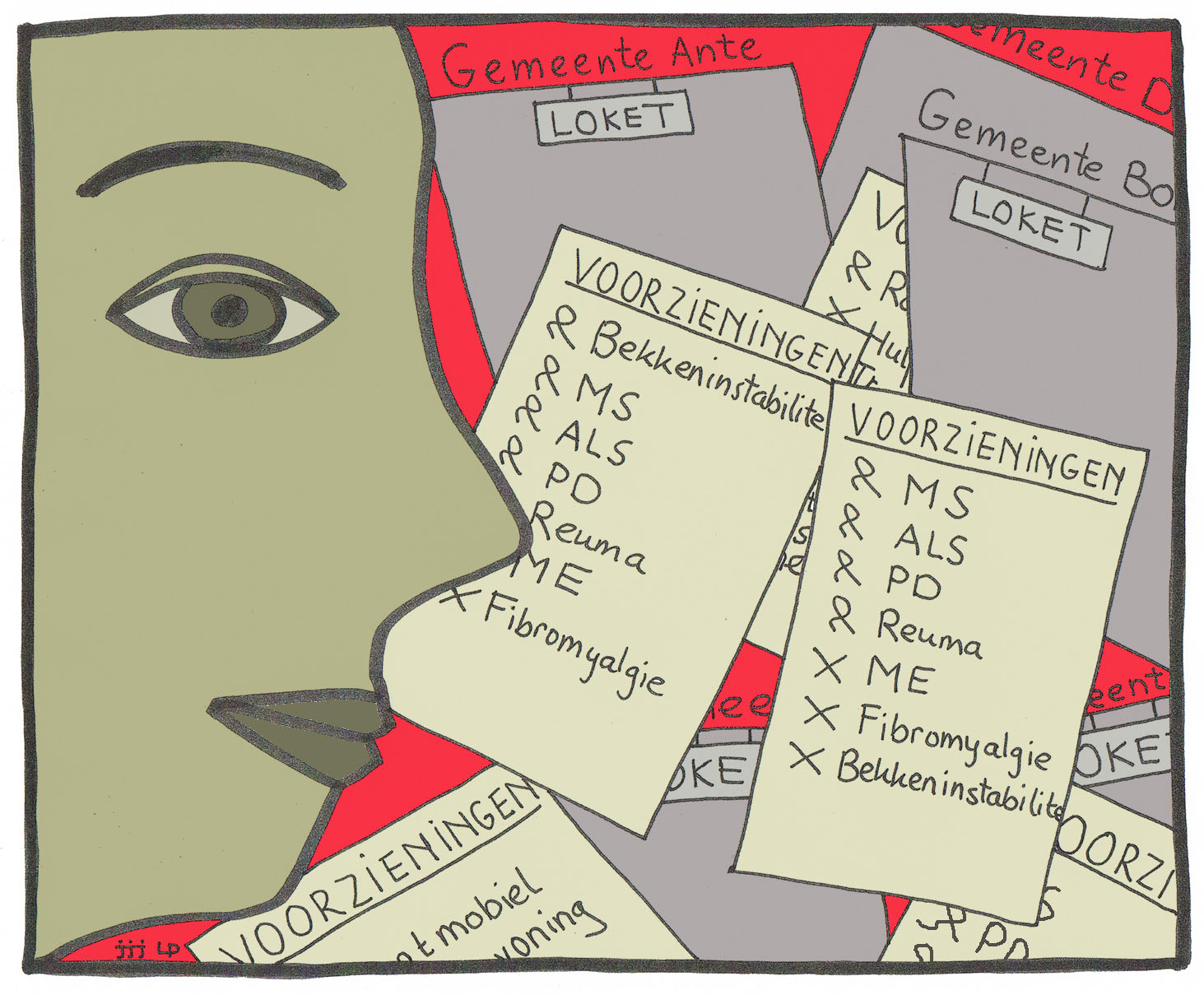| In deze rubriek wetten en voorzieningen vind je interviews en artikels over de aanvraag van aanpassingen, maar ook over de aanvraag van de benodigde zorg zoals bijvoorbeeld: persoonlijke verzorging, huishoudelijke hulp, begeleiding, verpleging of anderziens. Helaas zijn veel regels rondom de aanvraag van hulpmiddelen en de benodigde zorg per gemeente en zorgverzekeraar verschillend. Ook krijg je met bepaalde ziektebeelden moeilijker de benodige zorg en hulpmiddelen dan bij gangbaardere ziektebeelden. In de rubriek PGB vind je verhalen van lotgenoten die gebruik maken van een PGB. | Klik op de cartoon voor een vergroting. Grafische bijdrage van Leonie Palsma |