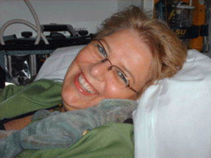 Ik mis het vreselijk om niet meer te kunnen gaan en staan waar ik wil. Mijn beperkingen zijn in het afgelopen jaar zo slecht geworden dat dit niet anders kan. Je wordt beperkt in je doen en laten en je leven wordt anders, maar ik merk wel aan mezelf dat ik er redelijk mee om kan gaan. Ik moet dan ook zeggen dat mijn werk heel veel uitmaakt in deze situatie. Als ik dat niet zou hebben en de hele dag naar buiten zo moetenstaren, dan zouden ze me een spuitje mogen geven. Nu heb ik mijn werk. Mijn vrienden komen naar mij toe. Gelukkig ben ik dol op lezen en ook tv kijken doe ik graag. ’s Avonds neem ik vaak dingen op om die overdag te kijken, als ik eens geen zin heb om te werken of gewoon te ziek ben. Dan is de tv of een boek een goede uitkomst. Ik laat ook wel eens een luisterboek komen,maar daarbij val ik meestal in slaap.