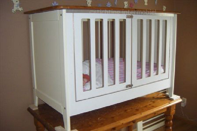 Het ledikantje is aangepast door een nieuwe zijwand te maken van een plaat multiplex. Deze is helemaal netjes gefreesd met deurtjes erin. Met een simpele scharnier zijn de deurtjes vastgemaakt en met een schuifje worden de deurtjes gesloten. Je moet wel een handige timmerman met goed gereedschap in de buurt hebben. Daarna is het bedje op een gewone eettafel gezet en vastgezet met blokjes hout.