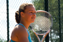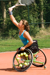 | Vergt het veel aanpassingen om vanuit een rolstoel te tennissen? Om de sport te kunnen beoefenen is een speciale tennisrolstoel nodig. Je kunt bij rolstoeltennis met een gewoon racket spelen. Marjolein raadt beginners wel aan om een licht racket met een groot blad te gebruiken. Ook moet de grip van het racket niet te dik zijn, omdat je tijdens het rollen zowel de hoepel van de rolstoel als het tennisracket in één hand moet kunnen houden. Hoe zien de trainingen eruit? Marjolein traint vier keer per week. De trainingen duren meestal twee uur. Twee keer per week heeft Marjolein privétraining en twee keer per week traint ze bij de Nationale Selectie. Marjolein heeft trainers die gespecialiseerd zijn in rolstoeltennis. Marjolein: ‘Wanneer je de sport wilt leren, is het belangrijk dat je trainer wat afweet van rolstoeltennis. Natuurlijk kun je gewoon bij de trainer van je eigen club lessen nemen, maar het wordt dan wel lastig om ook je rollen goed te ontwikkelen.’ Er zijn eendaagse cursussen waarin tennistrainers de basiskennis van het rolstoeltennis bijgebracht kunnen krijgen. De trainingen zijn dicht bij het huis van Marjolein. Ze heeft een auto waarmee ze zelf naar de tennishal rijdt. Voorheen werd ze altijd gebracht door familie of een taxi. Nu Marjolein zelf kan rijden, kost het haar minder tijd en dus minder energie. |