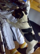 Wij hebben geen hulphond, omdat ook wij er niet voor in aanmerking komen. Dit omdat ik geen personen kon vinden die voor hem zou kunnen zorgen als er met mij iets zou gebeuren. Ik kan gewoon niemand vinden die bereid is om te helpen. Daarom hebben we zelf een hond getraind die alles voor me doet, in dit geval is het een laagbenige jackrussel. Voor kerst 2007 kon ik alles met commando's doen, maar sinds kerst heb ik een cva gekregen, hierdoor zijn mijn stembanden en nog meer dingen verlamd. Dus commando's kan ik nu vergeten, maar nu leren we samen sinds anderhalve maand gebarentaal. Diesel kent nu en de commando's en gebarentaal. Het is strak trainen omdat de bewegingen van de hand minimaal zijn maar hij snapt het helemaal. Het is een kanjer, mijn aller allergrootste vriend. |