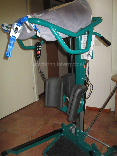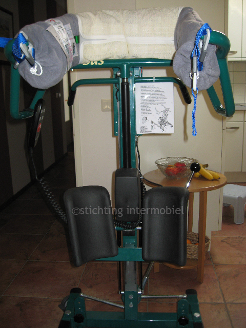 De tilband wordt bevestigd onder de oksels. Je wordt als het ware omhoog en vooruit uit je stoel gehesen. De tillift is een goede stahulp.