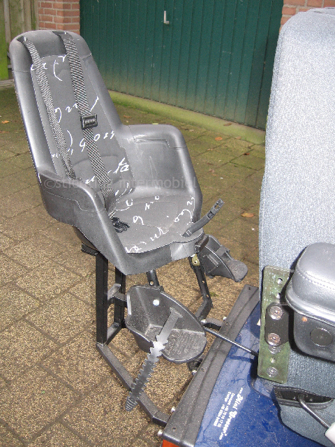 Ik heb een kinderstoeltje van Bobike (merk wat veel voor op fietsen wordt gebruikt) achterop mijn scootmobiel. Volgens de gemeente waar ik woon is dit de enige veilige en geheel goedgekeurde manier om kinderen op je scootmobiel mee te nemen. Het stoeltje is met een frame stevig bevestigd achter mijn stoel. Het enige nadeel is dat ik mijn zoontje via de spiegel niet kan zien omdat hij echt achter mijn stoel zit, dus dan moet ik me omdraaien. Maar nu hij gewend is weet ik dat hij het helemaal prima vindt achterop en dus voel ik ook niet zo vaak de behoefte om hem in de gaten te houden. Het stoeltje kan een gewicht tot 20 kg. dragen dus daar kunnen we wel even mee vooruit. Verder geldt hetzelfde als bij de fietsstoeltjes; zodra je kindje goed kan zitten mag hij/zij erin. Ik kan hem in het stoeltje stevig vastmaken met de riempjes, en ook de voetjes kunnen vastgemaakt worden op de verstelbare voetsteuntjes. Wij vinden het een heerlijke oplossing en ik voel me weer een stuk mobieler zo!