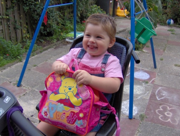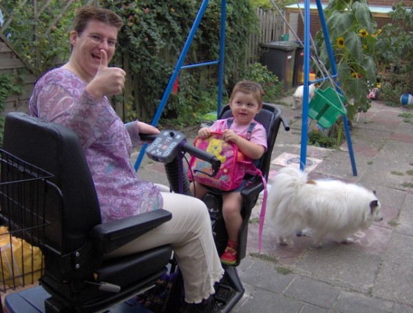 | Shifra heeft tot 3,5 jaar op de scootmobiel gezeten tegenover me. Toen hield de scootmobiel ermee op en moest er een andere komen. Omdat Shifra nu al bijna te groot was voor het kinderzitje is er een gewone scootmobiel gekomen. Nu gaan we ook elke dag samen op stap. Shifra staat gewoon op de scootmobiel tussen mijn benen. Het gaat nog prima maar langzaam aan leren we Shifra zelf te fietsen, zodat ze als ze 5 jaar is straks naast de scootmobiel kan meefietsen naar school. De tijd gaat erg snel en kleine meisjes worden groot. Ze is nu al heel zelfstandig en ik geniet van elke nieuwe stap die zet. Geschreven door Elsa Groenheide Geredigeerd door Veroni Steentjes Gebouwd door Monique van Dongen |