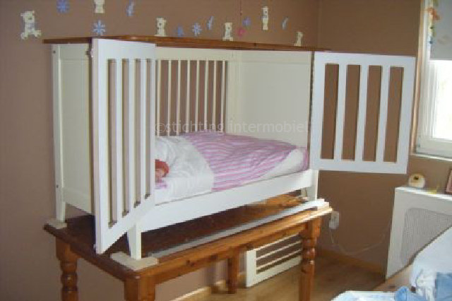 Het ledikantje is aangepast door een nieuwe zijwand te maken van een plaat multiplex. Deze is helemaal netjes gefreesd met deurtjes erin. Met een simpele scharnier zijn de deurtjes vastgemaakt en met een schuifje worden de deurtjes gesloten. Je moet wel een handige timmerman met goed gereedschap in de buurt hebben. Daarna is het bedje op een gewone eettafel gezet en vastgezet met blokjes hout.