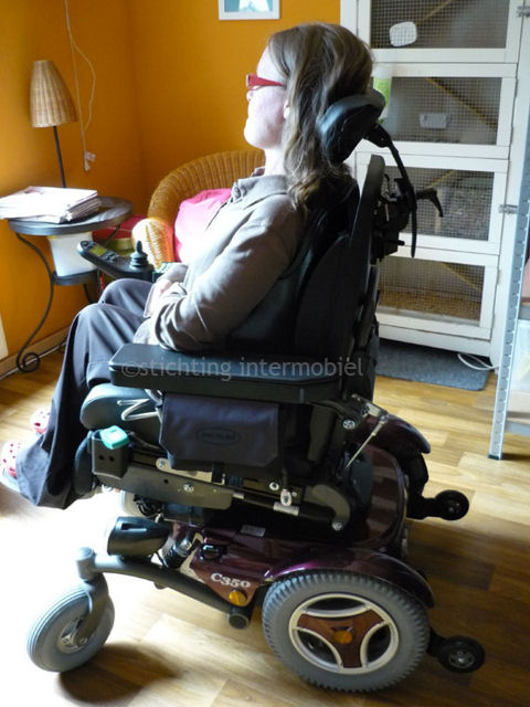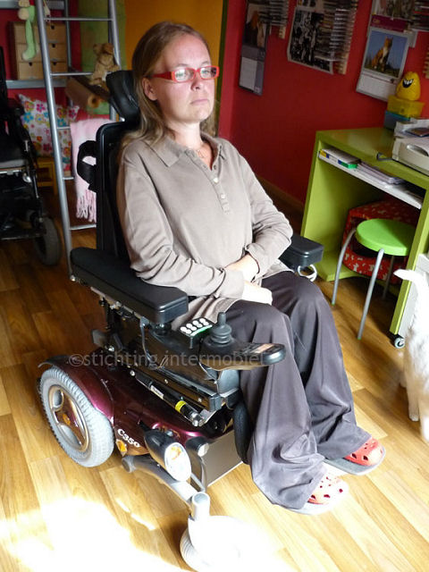 Sinds twee weken heb ik mijn nieuwe rolstoel een Permobil c350. Vroeger was ik totaal tegen Permobil rolstoelen en had ik een Leader die ik beter vond, maar vrij lomp oogt. Met Permobil rolstoelen moet je omgekeerd rijden en dat was niks voor mij. Ook hadden ze enkele trage stoelen. Maar Permobils hebben ook voordelen; zo hebben ze een comfortabele zitting, veel verschillende opties en ziet hij er mooi uit.Het grootste voordeel van de Permobil is voor mij de functie dat ik de stoel in hoogte kan verstellen. Dat kon ik niet bij mijn vorige stoel. De functie kwam al direct van pas toen ik moest gaan stemmen. Stemhokjes zijn namelijk gemaakt voor mensen die kunnen staan. Aan rolstoelpatiënten wordt duidelijk niet gedacht. Al moeten wij ook gewoon stemmen... Je had die mensen moeten zien kijken toen ik zo de hoogte inging, grappig. Maar niet alleen voor het stemmen is de functie handig. Als ik ergens wil betalen en de balie is te hoog, of simpel thuis iets uit de ijskast wil pakken, kom ik er nu gewoon bij.Met de nieuwe Permobil C350 heb ik nu ook elektronische voetsteunen. Handig als je even wil rusten en je benen wat vooruit wil doen. Ik heb vaak pijn aan mijn voeten van het altijd gewoon rechtstaan. Zo af en toe eens een andere houding kunnen aannemen, doet veel.Een kantelsysteem en een automatische rugleuning had ik ook op mijn vorige stoel. Maar wat nog meer nieuw is aan mijn nieuwe stoel, is een schelp voor mijn rug. Ik vroeg daar niet echt om maar aangezien ik toch wel een zware scoliose heb, ondanks dat ik geopereerd ben voor een CD in mijn rug, kan een beetje extra steun geen kwaad. Al moet ik wel wennen aan zo’n schelp. Zeker bij het aankleden is het nog niet altijd even praktisch om niet te zeggen onhandig! Maar dat komt omdat de schelp nog niet volledig is afgewerkt waardoor hij niet zo goed glijdt. Het schuim is daarvoor te stroef. Als hij eenmaal bekleed is, zou het beter moeten zijn. De schelp wordt helemaal passend gemaakt voor je rug. Eerst moet je in een zak gaan liggen die de vorm van je rug aanneemt, dan gieten ze daar pleister(gips?) in en daarmee maken ze dan de schelp.Een extra optie waar ik ook voor koos, zijn volle banden. Aangezien ik vaak buiten kom had ik met mijn oude stoel geregeld een platte band. Ik woon echter alleen en heb dus niet altijd iemand om me heen om me te helpen, laat staan een band te plakken of me te verplaatsen in een andere stoel. De nieuwe rolstoel rijdt wel iets harder (minder hard??), zeker op kinderkopjes of in het gras. Veel hangt van de ondergrond af, maar hij is wel heel krachtig, krachtiger dan je zou denken.Hij weegt een 156 kg meer dan mijn vorige stoel. Ze hebben hem gewogen in het ziekenhuis. Ik heb gekozen voor de kleur wijnrood. Je kon ook kiezen uit zwart, zilver, marineblauw en knalgeel. Voor blauw ben ik niet zo, grijs zullen de meeste mensen nemen en op zwart zie je sneller vuil. Geel gaat denk ik snel vervelen, daarom koos ik dus voor rood. Ik heb geprobeerd er mijn eigen toets aan te geven door er dierenpootjes op te plakken. Ik ben namelijk een grote dierenvriend...Hij rijdt 10 a 12 km per uur en kan 25 kilometer afleggen. Op zich iets minder kilometers dan mijn vorige stoel, maar veel verder kan ik toch niet want dan ben ik fysiek uitgeput.