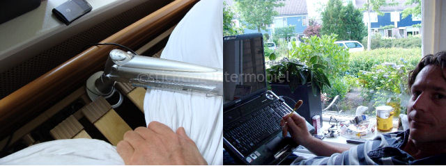 De armsteun is ideaal al je geen verrijdbaar bedtafeltje onder je bed kunt schuiven. De armsteun werkt op een gasveer en kan in hoogte worden versteld. Ook is de hoek van het toetsenbord kantelbaar zodat je makkelijk kunt typen. Eén nadeel van de armsteun is dat deze niet echt lang is. De armsteun kan op een klein tafeltje vastgeklemd worden en dan dicht tegen het bed aan zetten. Of je kunt de armsteun ook aan de lattenbodem van je bed vastmaken. Het is ideaal en een werkbare oplossing om toch vanuit bed te kunnen computeren. De armsteun is overigens van zeer degelijk materiaal gemaakt