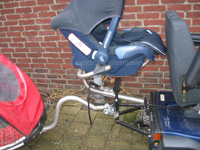 Onder de bevestiging van het stoeltje en de Maxicosi is een soort trekhaak gemaakt. Hiermee kan ik de fietskar bevestigen. De fietskar is geleverd door RVS en deze hoort als het ware bij de scootmobiel. Daarom is dit ook de enige die door de gemeente vergoed werd. De bevestiging van de fietskar is wel verlengd omdat ik anders geen bochten kon nemen, de stang duwde dan steeds tegen de maxicosi of fietsstoel aan. Nu werkt het prima. Eigenlijk was in het begin de bedoeling om in de fietskar een babyschaal te plaatsen voor de maxicosi, en het fietstoeltje gewoon te laten zitten voor mijn oudste zoontje. Je hebt de baby dan lekker warm en beschut in de kar, dat vond ik toch een wat fijner idee. Maar daar wilde de leverancier niet aan meewerken. I.v.m. aansprakelijkheid wilden RVS, Ligtvoet en de gemeente zich daar de vingers niet aan branden. Daarom is uiteindelijk voor deze oplossing gekozen.