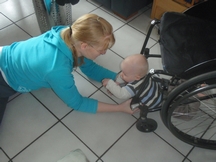 Ook kon ik Arjun vrij makkelijk tillen. Nu hij groter is, gaat dat een stukje moeilijker. Ik kan hem nu nog maar kort en kleine stukjes dragen. Voor grotere afstanden laat ik Arjun zelf kruipen en anders doe ik hem in de kinderwagen. Mijn kinderwagen is heel erg belangrijk voor mij, want daarmee kan ik Arjun makkelijk verplaatsen en hem veilig laten zitten, zonder dat hij wegkruipt.